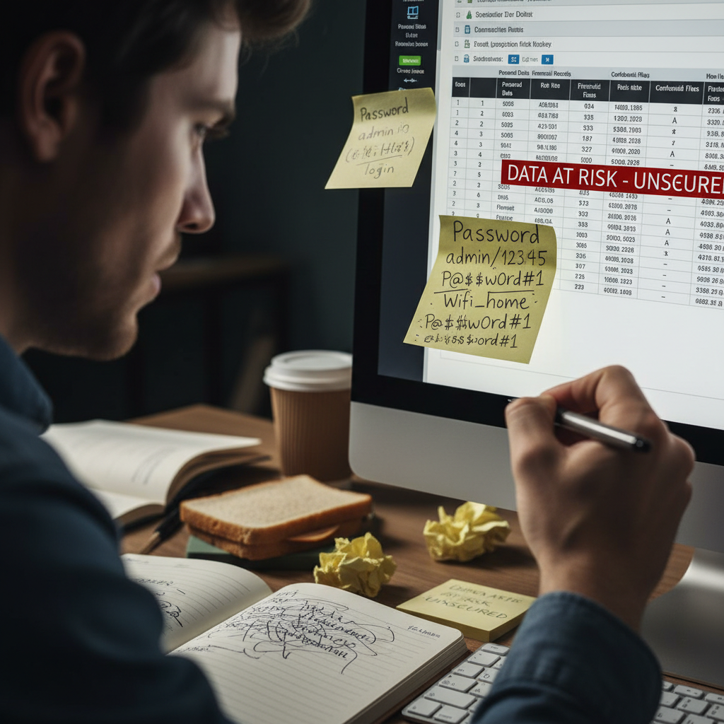 - Zapisywanie haseł w notatniku lub na mailu.